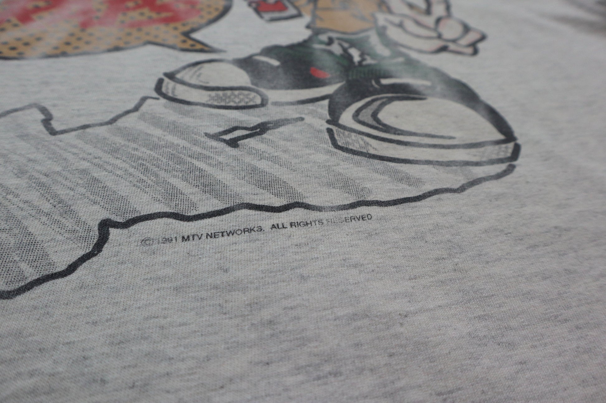 Original Shirt der MTV-Hip-Hop-Show Yo! MTV Raps von 1991, mit Cartoon-Backprint und grafischem Logo-Design. Die Show brachte Rap erstmals ins Mainstream-Fernsehen und wurde zum visuellen Symbol der frühen 90s-Hip-Hop-Kultur. Eines der seltensten authentischen Yo! MTV Raps Tees, heute nur noch selten im Umlauf.